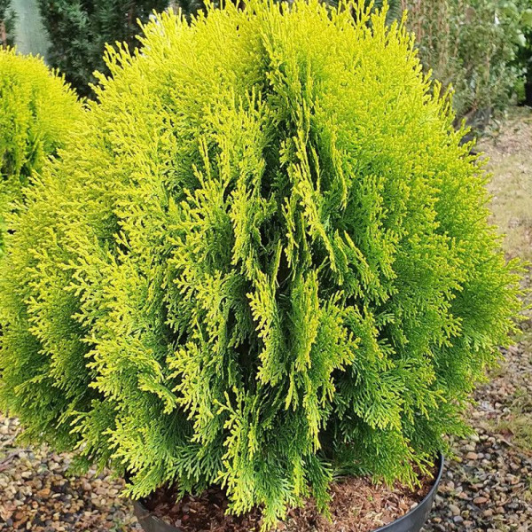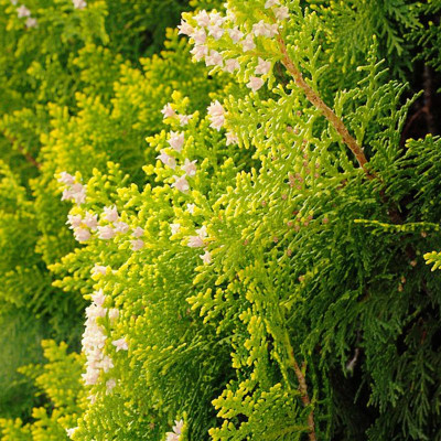 Τhuja orientalis aurea nana- . 'Aurea Nana' is an evergreen dwarf conifer growing slowly to make a small ovoid shrub with dense, erect sprays of yellow-green foliage, brightest at the tips.
